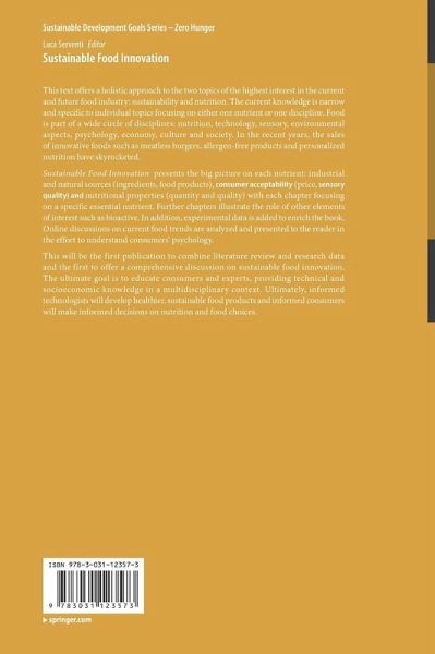 Sustainable Food Innovation presents the big picture on each nutrient: industrial and natural sources (ingredients, food products), consumer acceptability (price, sensory quality) and nutritional properties (quantity and quality) with each chapter focusing on a specific essential nutrient. Further chapters illustrate the role of other elements of interest such as bioactive. In addition, experimental datais added to enrich the book. Online discussions on current food trends are analyzed and presented to the reader in the effort to understand consumers' psychology.