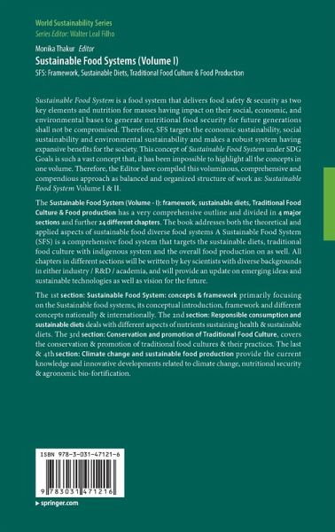 The 1st section: Sustainable Food System: concepts & framework primarily focusing on the Sustainable food systems, its conceptual introduction, framework and different concepts nationally & internationally. The 2nd section: Responsible consumption and sustainable diets deals with different aspects of nutrients sustaining health & sustainable diets. The 3rd section: Conservation and promotion of Traditional Food Culture, covers the conservation & promotion of traditional food cultures & their practices. The last & 4th section: Climate change and sustainable food production provide the current knowledge and innovative developments related to climate change, nutritional security & agronomic bio-fortification.