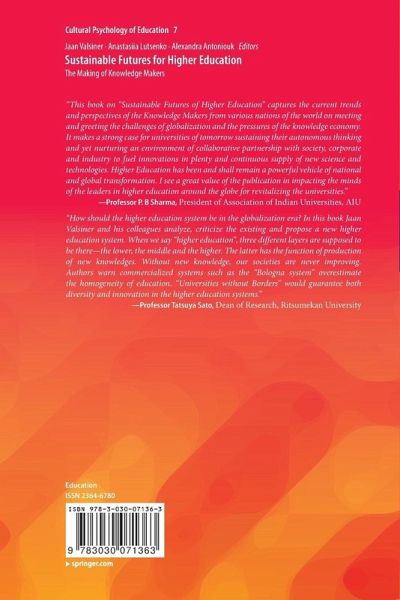 Series Editor's Preface (Giuseppina Marsco, University of Salerno and Federal Universty of Bahia).- Foreword: Utopia for Practice: The University of Antarctica Project. Jaan Valsiner (Aalborg University).- Introduction: Higher education at crossroads: between knowledge and commerce.- Chapter 1. Changing views of knowledge and practice in American higher education. Nancy Budwig (Clark University, Worcester, MA USA and Senior Fellow, Association of American Colleges and Universities).- Chapter 2. When the market wins over research and higher education. Sylvie Paycha (Universität Potsdam, Germany).- Part I. Economic factors in contemporary higher education.- Chapter 3. Organisational Learning Mechanisms and Corporate Entrepreneurial Orientation. Anastasiia Lutsenko (UGSM-Monarch Business School, Hagendorn-Zug, Switzerland).- Chapter 4. The role of venture capital in the national innovative system. Larisa Antoniuk andAnastasiia Zaprovodiuk (International Economics Department, KNEU, Ukraine).- Chapter 5. The emerging technology as an economic policy category. Vitaly Gryga (The Institute for Economics and Forecasting of NAS, Ukraine).- Chapter 6. Scientific cooperation in basic research and higher education. Olha Krasovska, Valentyna Andrushchenko, Irina Velichko(The State Fund for Fundamental Research, Kyiv, Ukraine).- Chapter 7. Statistical indicators in science: An Ukrainian example. Igor Yegorov (The Institute of Economics and Forecasting, National Academy of Sciences of Ukraine, Ukraine).- Chapter 8. Building the (Higher) Education Stakeholder: The Realities of Economics in Higher Education. Geanina Nae and Virgil Nae (Luxembourg).- Part II UNIVERSITIES in the middle of globalization.- Chapter 9. Making universities grow: New Zealand experience. Robert Greenberg (University of Auckland, New Zealand).-Chapter 10. Challenges for higher education: the case of Ukraine. Andryi Stavytskyy (National Taras Shevchenko University of Kyiv, Ukraine).- Chapter 11. Global Competitiveness of Universities. Volodymyr Satsyk (Political Economy Department at Kyiv National Economic University, Uktaine).- Chapter 12. Good university, excellent professor: competing quality perspectives in higher education. Mati Heidmets, Maiki Udam, Kätlin Vanari, Birgit Vilgats (Tallinn University, Estonia).- Chapter 13. Science and higher education in Poland: changing rules.- Adam Borkowski(Polish Academy of Sciences, Poland).- Chapter 14. New India-universities in the middle of economic development.Girishwar Misra and Rishabh Kumar Mishra (Mahatma Gandhi International University, Wardha, India).- Chapter 15. The constitutive crisis of universities: born to be for few, challenged to be for all. Jorge Tarcísio Da Rocha Falcão (Universidade Federal do Rio Grande del Norte, Brazil).- Part III. WHAT KINDS OF KNOWLEDGE MAKERS?.- Chapter 16. Selected theses on science. Eugene S. Kryachko (University of Liege, Belgium, and N. N. Bogolyubov Institute for Theoretical Physics, Ukraine).- Chapter 17. Educating journalists: Towards philosophical sophistication. Eleonora Shestakova (Donetsk, Ukraine).- Chapter 18. Manufacturing the Industrial Citizen. Joshua W. Clegg (John Jay College and The Graduate Center, City University of New York) Joseph A. Ostenson (The University of Tennessee at Martin) and Bradford J. Wiggins (Brigham Young University - Idaho).-Chapter 19. Educating specialists in the context of postmodern citizenship: keep calm and carry on. Jorge Castro-Tejerina (UNED-Madrid, Spain).- Part IV. CURRENT COLLABORATIONS AND FUTURE NEEDS in knowledge making.- Chapter 20. Education without fear: Going beyond the curriculae. Sarah Dick, Jennifer Hausen, Lina Jacob Carande (Université du Luxembourg). Franziska Sawitzki (Universität Osnabrück) and Marisa Tenbrock (Université du Luxembourg).- Chapter 21. Creativity in Higher education: Apprenticeship as a 'thinking-model' for bringing back more dynamic, teaching and research in a university context. Lene Tanggaard (Aalborg Universitet, Denmark).- Chapter 22. Beyond Examinations and Assessment: Pathways to productivity. Rebekka Mai Eckerdal (Viborg, Denmark).- Chapter 23. Non vitae sed scholae discimus: About learning to the point or the endless travel of research. Dominik S. Mihalits and Natalie Rodax (Sigmund Freud PrivatUniversität Wien).- Chapter 24. Implementation of curriculum theory in formation of specialists in higher education. Kaarel Haav (Tallinn Technical University, Estonia).- Part V. General Conclusions: Quo vadis, higher education?.- Chapter 25. What's happened to quality? Thomas Szulevicz and Casper Feilberg (Aalborg University, Denmark).- Chapter 26. Higher education: from intellectual asylum and fulfilling of social orders to creating arenas for scientific revolutions . Jaan Valsiner (Aalborg University, Denmark).