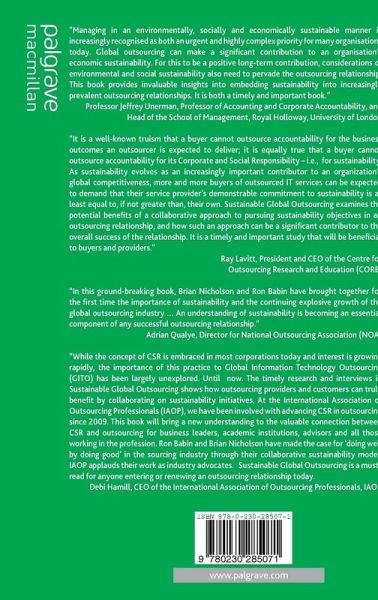Introduction: Achieving social and environmental responsibility in global outsourcing Chapter 1: Why is Sustainable Outsourcing Important? Chapter 2: Integrating Sustainability and Outsourcing Chapter 3: Measuring Sustainability Chapter 4: Collaborating for shared value Chapter 5: Leveraging sustainability in relationships Chapter 6: Steering a course on sustainability Conclusion
