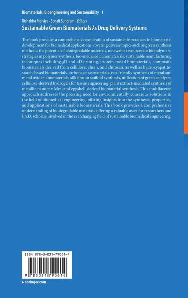 The book provides a comprehensive exploration of sustainable practices in biomaterial development for biomedical applications, covering diverse topics such as green synthesis methods, the potential of biodegradable materials, renewable resources for biopolymers, strategies in polymer synthesis, bio-mediated nanomaterials, sustainable manufacturing techniques including 3D and 4D printing, protein-based biomaterials, composite biomaterials derived from cellulose, chitin, and chitosan, as well as hydroxyapatite-starch-based biomaterials, carbonaceous materials, eco-friendly synthesis of metal and metal oxide nanomaterials, silk fibroin scaffold synthesis, utilization of green catalysts, cellulose-derived hydrogels for tissue engineering, plant extract-mediated synthesis of metallic nanoparticles, and eggshell-derived biomaterial synthesis. This multifaceted approach addresses the pressing need for environmentally conscious solutions in the field of biomedical engineering, offering insights into the synthesis, properties, and applications of sustainable biomaterials. This book provides a comprehensive understanding of biodegradable materials, offering a valuable asset for researchers and Ph.D. scholars involved in the ever-changing field of sustainable biomedical engineering.