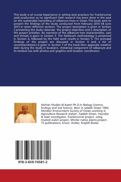 This study is of crucial importance in setting best practices for frankincense yield production as no significant field research has been done in the past on the sustainable harvesting of olibanum trees in Oman.This book aims to present the findings of the study conducted from February 2010 till June 2013 in seven different sections. The project description is given in Section 2 presenting the study rationale, the project objectives and a description of the project activities. An overview of the olibanum tree characteristics, uses and threats is given in Section 3. The fieldwork methodology is presented in Section 4, followed by the field work results in Section 5. The principal findings of the project are discussed in Section 6 and a list of recommendations is given in Section 7 of the book.then appendix weather date during the study in locations, chimerical component of olibanum and its medical use.with photos and graphics and location coordinates.