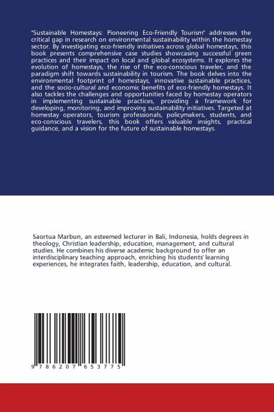 "Sustainable Homestays: Pioneering Eco-Friendly Tourism" addresses the critical gap in research on environmental sustainability within the homestay sector. By investigating eco-friendly initiatives across global homestays, this book presents comprehensive case studies showcasing successful green practices and their impact on local and global ecosystems. It explores the evolution of homestays, the rise of the eco-conscious traveler, and the paradigm shift towards sustainability in tourism. The book delves into the environmental footprint of homestays, innovative sustainable practices, and the socio-cultural and economic benefits of eco-friendly homestays. It also tackles the challenges and opportunities faced by homestay operators in implementing sustainable practices, providing a framework for developing, monitoring, and improving sustainability initiatives. Targeted at homestay operators, tourism professionals, policymakers, students, and eco-conscious travelers, this book offers valuable insights, practical guidance, and a vision for the future of sustainable homestays.
