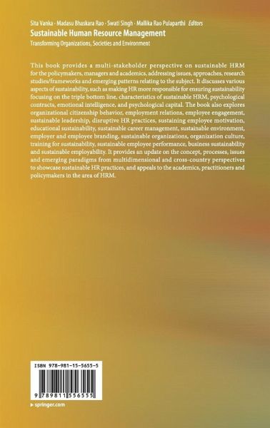 This book provides a multi-stakeholder perspective on sustainable HRM for the policymakers, managers and academics, addressing issues, approaches, research studies/frameworks and emerging patterns relating to the subject. It discusses various aspects of sustainability, such as making HR more responsible for ensuring sustainability focusing on the triple bottom line, characteristics of sustainable HRM, psychological contracts, emotional intelligence, and psychological capital. The book also explores organizational citizenship behavior, employment relations, employee engagement, sustainable leadership, disruptive HR practices, sustaining employee motivation, educational sustainability, sustainable career management, sustainable environment, employer and employee branding, sustainable organizations, organization culture, training for sustainability, sustainable employee performance, business sustainability and sustainable employability. It provides an update on the concept, processes, issues and emerging paradigms from multidimensional and cross-country perspectives to showcase sustainable HR practices, and appeals to the academics, practitioners and policymakers in the area of HRM.
