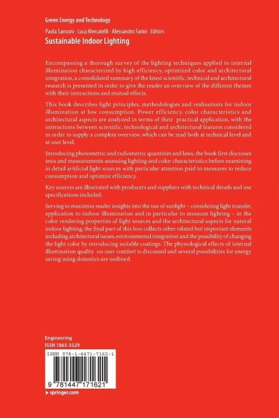 This book describes light principles, methodologies and realisations for indoor illumination at low consumption. Power efficiency, color characteristics and architectural aspects are analyzed in terms of their practical application, with the interactions between scientific, technological and architectural features considered in order to supply a complete overview, which can be read both at technical level and at user level.