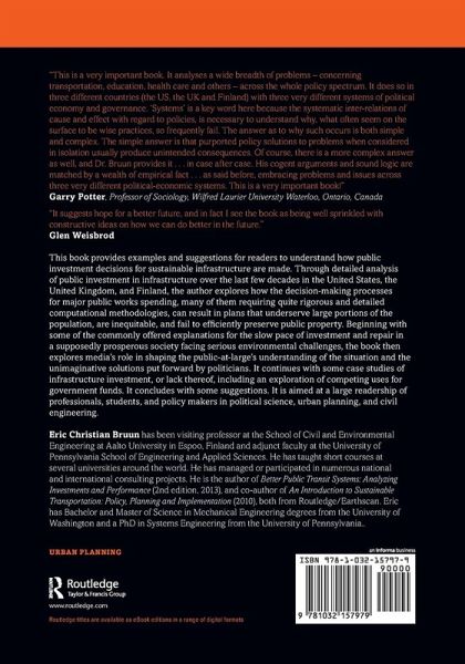 This book provides examples and suggestions for readers to understand how public investment decisions for sustainable infrastructure are made. Through detailed analysis of public investment in infrastructure over the last few decades in the United States, the United Kingdom, and Finland, the author explores how the decision-making processes for major public works spending, many of them requiring quite rigorous and detailed computational methodologies, can result in plans that underserve large portions of the population, are inequitable, and fail to efficiently preserve public property. Beginning with some of the commonly offered explanations for the slow pace of investment and repair in a supposedly prosperous society facing serious environmental challenges, the book then explores media's role in shaping the public-at-large's understanding of the situation and the unimaginative solutions put forward by politicians. It continues with some case studies of infrastructure investment, or lack thereof, including an exploration of competing uses for government funds. It concludes with some suggestions. It is aimed at a large readership of professionals, students, and policy makers in political science, urban planning, and civil engineering.