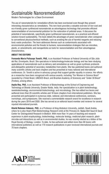 Fernanda Maria Policarpo Tonelli, PhD, is an Assistant Professor at Federal University of São João del Rei, Divinópolis, Brazil. She specializes in biotechnology/molecular biology and has been studying applications of nanomaterials such as delivery and remediation as well as green synthesis protocols and allelopathic potential of secondary metabolites from plants. She has published books and authored many scientific articles and book chapters and has presented at many national and international conferences. Dr. Tonelli is active in advocacy groups that support gender equality in science. Her efforts as a researcher have been recognized with various awards, including "For Women in Science Brazil" (awarded by L'Oréal Brasil, UNESCO-Brazil, and Brazilian Academy of Sciences) and "Under 30 Brazil" (Forbes), among others. Arpita Roy, PhD, is an Assistant Professor of Biotechnology at the School of Engineering and Technology at Sharda University, Greater Noida, India. Her specialization is in plant biotechnology, nanobiotechnology, environmental biotechnology, and microbiology. She has edited two books and authored more than 25 scientific articles and 18 book chapters from international publishers. She has presented and participated in numerous state, national, and international conferences, seminars, workshops, and symposiums. She received a commendable research award for excellence in research during the years 2019 and 2020. She has served as an editorial board member and reviewer for several reputed international journals. Khalid Rehman Hakeem, PhD, is a Professor at King Abdulaziz University, Jeddah, Saudi Arabia, where he is also Head (Plant Biotechnology Research Unit) at the Princess Dr. Najlaa Bint Saud Al Saud Center for Distinguished Research in Biotech. With more than 14 years of teaching and research experience in plant ecophysiology, biotechnology, molecular biology, medicinal plant research, plantmicrobe- soil interactions as well as in environmental studies, he was recently elected as a fellow of the Royal Society of Biology, London. To date, he has authored and edited more than 80 books with international publishers as well as 170 research publications in peer-reviewed international journals and 70 book chapters.