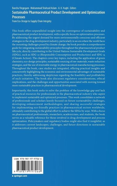 This book offers unparalleled insight into the convergence of sustainability and pharmaceutical product development, with a specific focus on optimization processes. By addressing the urgent demand for more environmentally conscious and efficient strategies in the drug development industry, particularly in an era where the world faces the mounting challenges posed by climate change, the book provides a comprehensive guide for integrating sustainability principles throughout the pharmaceutical product lifecycle, directly contributing to the United Nations Sustainable Development Goals (SDGs),…mehr
