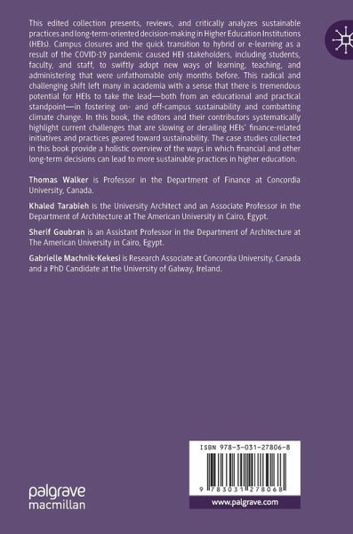 This edited collection presents, reviews, and critically analyzes sustainable practices and long-term-oriented decision-making in Higher Education Institutions (HEIs). Campus closures and the quick transition to hybrid or e-learning as a result of the COVID-19 pandemic caused HEI stakeholders, including students, faculty, and staff, to swiftly adopt new ways of learning, teaching, and administering that were unfathomable only months before. This radical and challenging shift left many in academia with a sense that there is tremendous potential for HEIs to take the lead - both from an educational and practical standpoint - in fostering on- and off-campus sustainability and combatting climate change. In this book, the editors and their contributors systematically highlight current challenges that are slowing or derailing HEIs' finance-related initiatives and practices geared toward sustainability. The case studies collected in this book provide a holistic overview of the ways inwhich financial and other long-term decisions can lead to more sustainable practices in higher education.