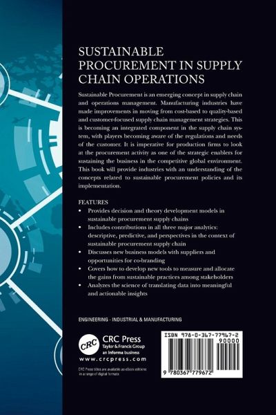 Sustainable Procurement is an emerging concept in supply chain and operations management. Manufacturing industries have made improvements in moving from cost-based to quality-based, and customer-focused supply chain management strategies. This is becoming an integrated component in the supply chain system, with players becoming aware of the regulations and needs of the customer. It is imperative for production firms to look at the procurement activity as one of the strategic enablers for sustaining the business in the competitive global environment. This book will provide industries with an understanding of the concepts related to sustainable procurement policies and its implementation. Provides decision and theory development models in sustainable procurement supply chains Includes contributions in all three major analytics: descriptive, predictive, and perspectives in the context of sustainable procurement supply chain Discusses new business models with suppliers and opportunities for co-branding Covers how to develop new tools to measure and allocate the gains from sustainable practices among stakeholders Analyses the science of translating data into meaningful and actionable insights