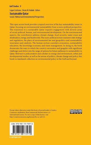 Chapter 1. Sustainable Qatar.- Chapter 2. The Evolvement of Qatar's Environmental Sustainability Policy: The Strategies, Regulations, and Institutions.- Chapter 3. Law and Governance Innovations on Sustainability in Qatar: Current Approaches and Future Directions.- Chapter 4. FIFA World Cup 2022 as a Catalyst for Environmental Sustainability in Qatar.- Chapter 5. Qatar Foundations: A Sustainability Innovator.- Chapter 6. Qatar's Energy Policy and the Transition Towards a Renewable and Carbon-Neutral Future.- Chapter 7. Qatar in the Energy Transition: Low Carbon Economy Challenges and Opportunities.- Chapter 8. A Systems Perspective on the Sustainable Development of Qatar .- Chapter 9. Sea Level Rise and the National Security Challenge of Sustainable Urban Adaptation in Doha and other Arab Coastal Cities.- Chapter 10. Assessing and Reporting Potential Environmental Risks Associated with Reefing Oil Platform During Decommissioning inQatar.- Chapter 11. The Domestic Water Sector in Qatar.- Chapter 12. Contribution of Non-Profit Organizations to Food Security Sustainability in the State of Qatar.- Chapter 13. Terrestrial Biodiversity in Arid Environments: One Global Component of Climate Crisis Resilience.- Chapter 14. Doha as a 15-Minute City - An Urban Fareej.- Chapter 15. Post-Oil Urbanism: A Need for Smart and Sustainable Urban Development Strategies and Framework in the Gulf States.- Chapter 16. Towards the Circular Qatari Zero-Waste Management Sector.- Chapter 17. Education for Sustainable Development in Qatar.- Chapter 18. Developing A Vibrant Entrepreneurship Ecosystem in Qatar: A Sustainable Pathway Toward the Knowledge-based Economy?.- Chapter 19. Pathways for a Sustainable Future.