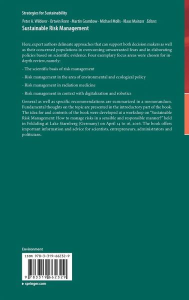 Here, expert authors delineate approaches that can support both decision makers as well as their concerned populations in overcoming unwarranted fears and in elaborating policies based on scientific evidence. Four exemplary focus areas were chosen for in-depth review, namely:- The scientific basis of risk management- Risk management in the area of environmental and ecological policy- Risk management in radiation medicine- Risk management in context with digitalization and roboticsGeneral as well as specific recommendations are summarized in a memorandum. Fundamental thoughts on the topic are presented in the introductory part of the book. The idea for and contents of the book were developed at a workshop on "Sustainable Risk Management: How to manage risks in a sensible and responsible manner?" held in Feldafing at Lake Starnberg (Germany) on April 14 to 16, 2016. The book offers important information and advice for scientists, entrepreneurs, administrators and politicians.