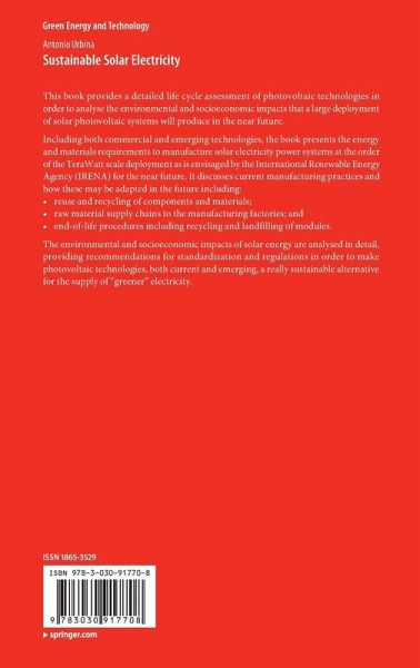 Including both commercial and emerging technologies, the book presents the energy and materials requirements to manufacture solar electricity power systems at the order of the TeraWatt scale deployment as is envisaged by the International Renewable Energy Agency (IRENA) for the near future. It discusses current manufacturing practices and how these may be adapted in the future including: reuse and recycling of components and materials; raw material supply chains to the manufacturing factories; and end-of-life procedures including recycling and landfilling of modules. The environmental and socioeconomic impacts of solar energy are analysed in detail, providing recommendations for standardization and regulations in order to make photovoltaic technologies, both current and emerging, a really sustainable alternative for the supply of "greener" electricity.