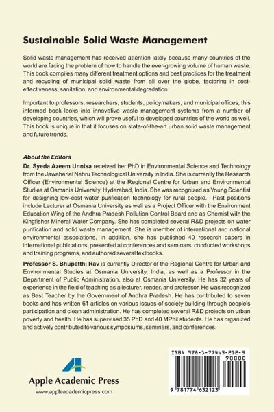 Dr. Syeda Azeem Unnisa received her PhD in Environmental Science and Technology from the Jawaharlal Nehru Technological University in India. She is currently the Research Officer (Environmental Science) at the Regional Centre for Urban and Environmental Studies at Osmania University, Hyderabad, India. She was recognized as Young Scientist for designing low-cost water purification technology for rural people. Past positions include Lecturer at that university as well as a Project Officer with the Environment Education Wing of the Andhra Pradesh Pollution Control Board and as Chemist with the Kingfisher Mineral Water Company. She has completed several R&D projects on water purification and solid waste management. She is member in international and national environmental sssociations. In addition, she has published 40 research papers in international publications, presented at conferences and seminars, conducted workshops and training programs, and authored several textbooks. Professor S. Bhupatthi Rav is currently Director of the Regional Centre for Urban and Environmental Studies at Osmania University, India, as well as a Professor in the Department of Public Administration, also at Osmania University. He has 32 years of experience in the field of teaching as a lecturer, reader, and professor. He was recognized as Best Teacher by Government of Andhra Pradesh. He has contributed to seven books and has written 61 articles on various issues of society building through people's participation and clean administration. He has completed several R&D projects on urban poverty and health. He has supervised 35 PhD and 40 MPhil students. He has organized and actively contributed to various symposiums, seminars, and conferences.