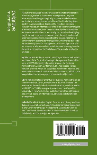 SYBILLE SACHS is Professor at the University of Zurich, Switzerland and Head of the Centre for Strategic Management: Stakeholder View at HWZ. She heads the research projects 'Good Practices of Stakeholder View' and 'ICT-Supported Stakeholder Management as an Entrepreneurial Success Factor' which are supported by different national and international academic and research institutions. EDWIN RÜHLI is Professor Emeritus for Business Administration at the University of Zurich, Switzerland. In 1970 he founded the Institute for Research in Business Administration, which he headed until 2000. In 1994 he was guest professor at the Columbia University in New York. He has published more than 200 papers on international, strategic and stakeholder management. ISABELLE KERN first studied English, German and History, and later Business IT. She is senior research assistant at the Centre for Strategic Management: Stakeholder View at HWZ (University of Applied Sciences for Business Administration Zurich, Switzerland), and wrote her dissertation at the University of Zurich on stakeholder and knowledge management.