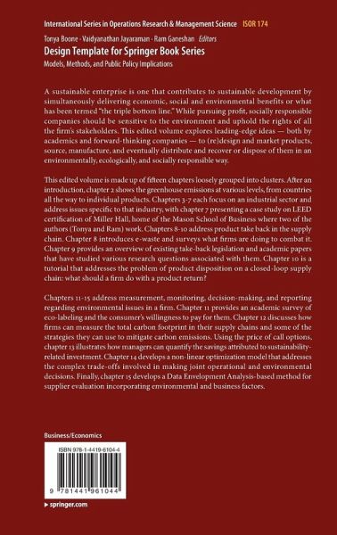 A sustainable enterprise is one that contributes to sustainable development by simultaneously delivering economic, social and environmental benefits or what has been termed "the triple bottom line." While pursuing profit, socially responsible companies should be sensitive to the environment and uphold the rights of all the firm's stakeholders. This edited volume explores leading-edge ideas - both by academics and forward-thinking companies - to (re)design and market products, source, manufacture, and eventually distribute and recover or dispose of them in an environmentally, ecologically, and socially responsible way.