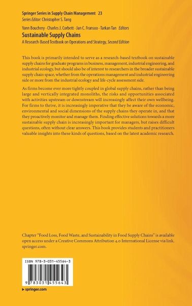 This book is primarily intended to serve as a research-based textbook on sustainable supply chains for graduate programs in business, management, industrial engineering, and industrial ecology, but should also be of interest to researchers in the broader sustainable supply chain space, whether from the operations management and industrial engineering side or more from the industrial ecology and life-cycle assessment side. As firms become ever more tightly coupled in global supply chains, rather than being large and vertically integrated monoliths, the risks and opportunities associated with activities upstream or downstream will increasingly affect their own wellbeing. For firms to thrive, it is increasingly imperative that they be aware of the economic, environmental and social dimensions of the supply chains they operate in, and that they proactively monitor and manage them. Finding effective solutions towards a more sustainable supply chain is increasingly important formanagers, but raises difficult questions, often without clear answers. This book provides students and practitioners valuable insights into these kinds of questions, based on the latest academic research. Chapter "Food Loss, Food Waste, and Sustainability in Food Supply Chains" is available open access under a Creative Commons Attribution 4.0 International License via link.springer.com.