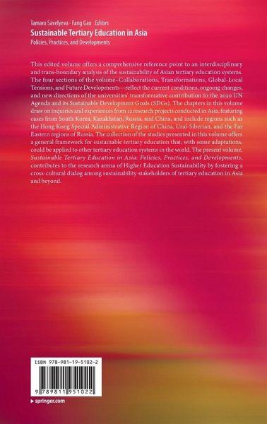 This edited volume offers a comprehensive reference point to an interdisciplinary and trans-boundary analysis of the sustainability of Asian tertiary education systems. The four sections of the volume -Collaborations, Transformations, Global-Local Tensions, and Future Developments-reflect the current conditions, ongoing changes, and new directions of the universities' transformative contribution to the 2030 UN Agenda and its Sustainable Development Goals (SDGs). The chapters in this volume draw on inquiries and experiences from 12 research projects conducted in Asia, featuring cases from South Korea, Kazakhstan, Russia, and China, and include regions such as the Hong Kong Special Administrative Region of China, Ural-Siberian, and the Far Eastern regions of Russia. The collection of the studies presented in this volume offers a general framework for sustainable tertiary education that, with some adaptations, could be applied to other tertiary education systems in the world. The presentvolume, Sustainable Tertiary Education in Asia: Policies, Practices, and Developments, contributes to the research arena of Higher Education Sustainability by fostering a cross-cultural dialog among sustainability stakeholders of tertiary education in Asia and beyond.