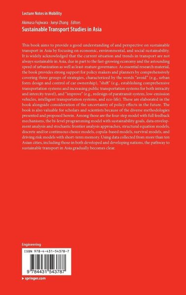 This book aims to provide a good understanding of and perspective on sustainable transport in Asia by focusing on economic, environmental, and social sustainability. It is widely acknowledged that the current situation and trends in transport are not always sustainable in Asia, due in part to the fast-growing economy and the astounding speed of urbanization as well as least-mature governance. As essential research material, the book provides strong support for policy makers and planners by comprehensively covering three groups of strategies, characterized by the words "avoid" (e.g., urban form design and control of car ownership), "shift" (e.g., establishing comprehensive transportation systems and increasing public transportation systems for both intracity and intercity travel), and "improve" (e.g., redesign of paratransit system, low-emission vehicles, intelligent transportation systems, and eco-life). These are elaborated in the book alongside consideration of the uncertainty of policy effects in the future. The book is also valuable for scholars and scientists because of the diverse methodologies presented and proposed herein. Among those are the four-step model with full feedback mechanisms, the bi-level programming model with sustainability goals, data envelopment analysis and stochastic frontier analysis approaches, structural equation models, discrete and/or continuous choice models, copula-based models, survival models, and driving risk models with short-term memory. Using data collected from more than ten Asian cities, including those in both developed and developing nations, the pathway to sustainable transport in Asia gradually becomes clear.