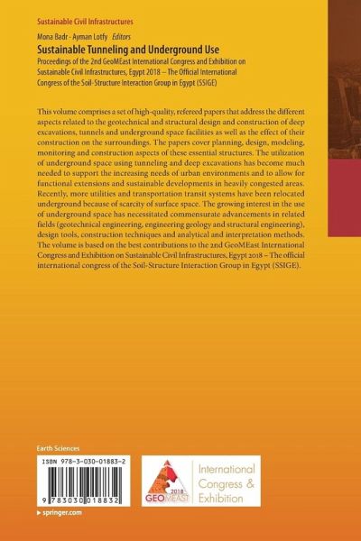 This volume comprises a set of high-quality, refereed papers that address the different aspects related to the geotechnical and structural design and construction of deep excavations, tunnels and underground space facilities as well as the effect of their construction on the surroundings. The papers cover planning, design, modeling, monitoring and construction aspects of these essential structures. The utilization of underground space using tunneling and deep excavations has become much needed to support the increasing needs of urban environments and to allow for functional extensions and sustainable developments in heavily congested areas. Recently, more utilities and transportation transit systems have been relocated underground because of scarcity of surface space. The growing interest in the use of underground space has necessitated commensurate advancements in related fields (geotechnical engineering, engineering geology and structural engineering), design tools, construction techniques and analytical and interpretation methods. The volume is based on the best contributions to the 2nd GeoMEast International Congress and Exhibition on Sustainable Civil Infrastructures, Egypt 2018 - The official international congress of the Soil-Structure Interaction Group in Egypt (SSIGE).