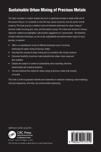 The rapid revolution in modern industry has led to a significant increase in waste at the end of the product lifecycle. It is essential to close the loop, secure resources, and join up the circular economy. This book provides a detailed review of extraction techniques for urban mining of precious metals including gold, silver, and the platinum group. The merits and demerits of various extraction methods are highlighted, with possible suggestions for improvements. The feasibility of hybrid extraction techniques, as well as the sustainability and environmental impact of every process, is explored.