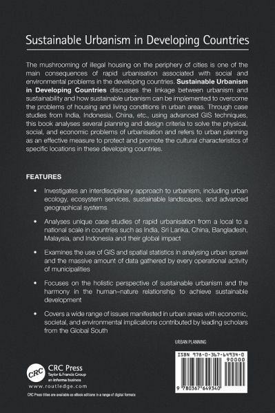 The mushrooming of illegal housing on the periphery of cities is one of the main consequences of rapid urbanisation associated with social and environmental problems in the developing countries. Sustainable Urbanism in Developing Countries discusses the linkage between urbanism and sustainability and how sustainable urbanism can be implemented to overcome the problems of housing and living conditions in urban areas. Through case studies from India, Indonesia, China, etc., using advanced GIS techniques, this book analyses several planning and design criteria to solve the physical, social, and economic problems of urbanisation and refers to urban planning as an effective measure to protect and promote the cultural characteristics of specific locations in these developing countries. FEATURES Investigates an interdisciplinary approach to urbanism, including urban ecology, ecosystem services, sustainable landscapes, and advanced geographical systems Analyses unique case studies of rapid urbanisation from a local to a national scale in countries such as India, Sri Lanka, China, Bangladesh, Malaysia, and Indonesia and their global impact Examines the use of GIS and spatial statistics in analysing urban sprawl and the massive amount of data gathered by every operational activity of municipalities Focuses on the holistic perspective of sustainable urbanism and the harmony in the human-nature relationship to achieve sustainable development Covers a wide range of issues manifested in urban areas with economic, societal, and environmental implications contributed by leading scholars from the Global South