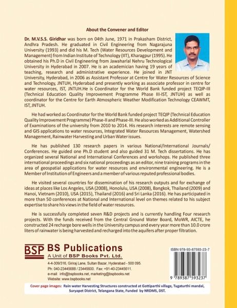 1. Challenges and Possible Solutions for Water Resources Management in the 21st Century 2. A Study on Hydro-geological Environment at Andhra University Campus, Visakhapatnam using Vertical Electrical Soundings and Pumping Tests 3. Precision Farming - A Scientific Approach for Sustainable Water and Environment Management 4. Computation of Sediment Yield over Un-gauged Stations using MUSLE and Fuzzy Model 5. Appropriate Intra Village Drinking Water Distribution Systems through "Mission Bhaghiratha" in Telangana State 6. Model Development for Prediction of Trap Efficiency of Sriramsagar Reservoir using Soft Computing Techniques 7. Sustainable Irrigation Water Management Practices in the Context of National Water Policy 2012 and United Nations Sixth Sustainable Development Goal on "Sustainable Management of Water" 8. Role of Climate Change on "Tropical Storms-Hurricanes-Typhoons"9. Ranking of GCMs based on Bayesian Model for Indian Summer Monsoon Rainfall 10.Aquasense: Development of Smart Water Monitoring System 11. Water Resources Development for Sustainable Production in Dryland Agriculture through Catchment Management 12. Fertigation in Fruit Crops 13. Water Resource Management for Sustainable Development 14. Decision Support System for Integrated Water Resources Management15. Application of Life Cycle Assessment in Landfilling 16. Sustainable Conservation Practices for Dryland Farming in Vidarbha Region of Maharashtra 17. Soil Moisture Monitoring: A Useful Indicator for Impact Analysis of Conservation Measures Adopted Catchment 18. Rainwater Management through In-Situ Soil and Water Conservation Techniques and Utilization of Harvested Water through Farm Pond 19. Storm Water Management using SWMM: A Case Study on Indraprastha Area, Belagavi 20. Pre-Historic Cultural Remains in Water Shed 21. Estimation of Ground Water Storage Changes in using Satellite Data 22. Radon Measurements in ozhikode Coast, SW India and its Implications 23. GIS & RS Application for ydrological & Environmental Planning - A Case study 24. Green Treatment of Acid Mine Drainage (AMD) Effluent for the Removal of Cu(II) using Chilli Stalks 25. Trend Analysis of Reference Evapotranspiration in a Hot and Humid Coastal Location in Tamilnadu State 26. Climate Change: Effects on Sustainable Scenario in India 27. Graphene for Sustainable Water 28. To Purifying of Ground Water at Sub Ground Level by Natural Methods 29. Assessing the Contribution of Climate Change in an Intense Weather Event: A Critical Risk Management 30. Quantitative and Morphometric Analysis of Selected Watersheds using GIS 31. Prediction Modeling of Combined Thermophillic Composting (Invessel) and Vermicomposting in the Bioconversion of VegetableMarket Waste