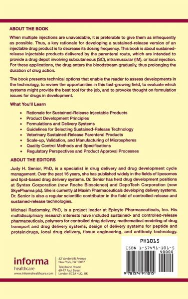 Sustained-Release Injectable Products focuses on the development process for sustained-release versions of drugs and delivery systems and administration routes. From the rationale and basic product development principles to regulatory issues and the approval process, expert contributions address virtually every aspect. They bring together common threads that apply to any sustained-release formulation, such as scale-up, safety, biocompatibility, analytical challenges, and quality assurance.