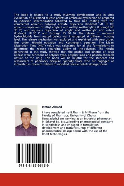 This book is related to a study involving development and in vitro evaluation of sustained release pellets of ambroxol hydrochloride prepared by extrusion spheronization followed by fluid bed coating with the commercial aqueous polyvinyl acetate dispersion (Kollicoat SR 30 D); aqueous dispersion of ethyl acrylate and methyl methacrylate (Eudragit NE 30 D) and aqueous dispersion of acrylic and methacrylic acid esters (Eudragit RL 30 D and Eudragit RS 30 D). The release of ambroxol hydrochloride from coated pellets was investigated at different coating level. The release mechanism was explored and explained with zero order, first order, Higuchi equation and Korsmeyer s equation. The Mean Dissolution Time (MDT) value was calculated for all the formulations to determine the release retarding ability of the polymers. The results generated in this study showed that the profile and kinetics of drug release were functions of polymer type, polymer load and physico-chemical nature of the drug. This book will be helpful for the students and researchers of pharmacy discipline specially those who are engaged or interested in research related to modified release pellets dosage forms.