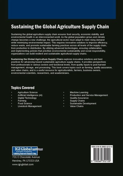 Sustaining the global agriculture supply chain ensures food security, economic stability, and environmental health in an interconnected world. As the global population grows and climate change becomes a new challenge, the agricultural sector must adapt to meet rising demand while minimizing environmental impact. This requires innovative solutions to improve efficiency, reduce waste, and promote sustainable farming practices across all levels of the supply chain, from production to distribution. By utilizing advanced technologies, ensuring collaboration, and implementing policies that prioritize environmental sustainability and social responsibility, organizations can build resilient and sustainable agricultural supply chains. Sustaining the Global Agriculture Supply Chain explores innovative solutions and best practices for advancing toward sustainable agriculture supply chains. It provides perspectives from professionals in various sectors and functional levels, from quality inputs to post-harvest management, storage, and processing. This book covers topics such as farming, quality assurance, and value chains, and is a useful resource for agriculturalists, farmers, business owners, environmental scientists, researchers, and academicians.