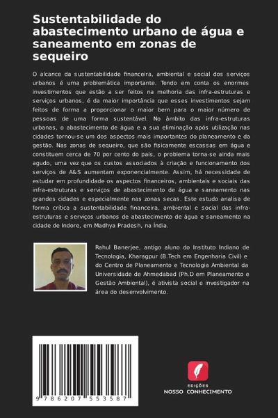 O alcance da sustentabilidade financeira, ambiental e social dos serviços urbanos é uma problemática importante. Tendo em conta os enormes investimentos que estão a ser feitos na melhoria das infra-estruturas e serviços urbanos, é da maior importância que esses investimentos sejam feitos de forma a proporcionar o maior bem para o maior número de pessoas de uma forma sustentável. No âmbito das infra-estruturas urbanas, o abastecimento de água e a sua eliminação após utilização nas cidades tornou-se um dos aspectos mais importantes do planeamento e da gestão. Nas zonas de sequeiro, que são fisicamente escassas em água e constituem cerca de 70 por cento do país, o problema torna-se ainda mais agudo, uma vez que os custos associados à criação e funcionamento dos serviços de A&S aumentam exponencialmente. Assim, há necessidade de estudar em profundidade os aspectos financeiros, ambientais e sociais das infra-estruturas e serviços de abastecimento de água e saneamento nas grandes cidades e especialmente nas zonas secas. Este estudo analisa de forma crítica a sustentabilidade financeira, ambiental e social das infra-estruturas e serviços urbanos de abastecimento de água e saneamento na cidade de Indore, em Madhya Pradesh, na Índia.