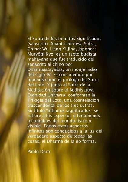 El Sutra de los Infinitos Significados (sánscrito: Ananta-nirdesa Sutra, Chino: Wu Liang Yi Jing, Japones: Murygi Kyo) es un texto budista mahayana que fue traducido del sánscrito al chino por Dharmajtayaas, un monje indio del siglo IV. Es considerado por muchos como el prólogo del Sutra del Loto . El termino "infinitos significados" se refiere a los aspectos o fenómenos incontables del mundo físico o visible. Todos estos aspectos infinitos son conducidos a la luz del verdadero aspecto de todas las cosas, el Dharma de la no forma. Pablo Daro