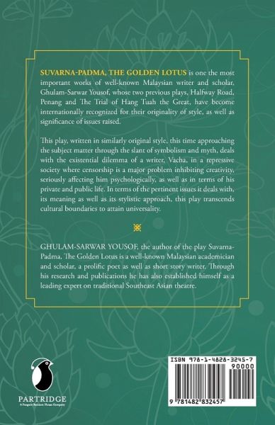 SuvaRna-Padma, the Golden Lotus is one the most important works of well-known Malaysian writer and scholar, Ghulam-Sarwar Yousof, whose two previous plays, Halfway Road, Penang and The Trial of Hang Tuah the Great, have become internationally recognized for their originality of style, as well as significance of issues raised. This play, written in similarly original style, this time approaching the subject matter through the slant of symbolism and myth, deals with the existential dilemma of a writer, Vacha, in a repressive society where censorship is a major problem inhibiting creativity, seriously affecting him psychologically, as well as in terms of his private and public life. In terms of the pertinent issues it deals with, its meaning as well as its stylistic approach, this play transcends cultural boundaries to attain universality.