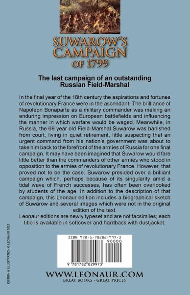 The last campaign of an outstanding Russian Field-Marshal In the final year of the 18th century the aspirations and fortunes of revolutionary France were in the ascendant. The brilliance of Napoleon Bonaparte as a military commander was making an enduring impression on European battlefields and influencing the manner in which warfare would be waged. Meanwhile, in Russia, the 69 year old Field-Marshal Suwarow was banished from court, living in quiet retirement, little suspecting that an urgent command from his nation's government was about to take him back to the forefront of the armies of Russia for one final campaign. It may have been imagined that Suwarow would fare little better than the commanders of other armies who stood in opposition to the armies of revolutionary France. However, that proved not to be the case. Suwarow presided over a brilliant campaign which, perhaps because of its singularity amid a tidal wave of French successes, has often been overlooked by students of the age. In addition to the description of that campaign, this Leonaur edition includes a biographical sketch of Suwarow and several images which were not in the original edition of the text. Leonaur editions are newly typeset and are not facsimiles; each title is available in softcover and hardback with dustjacket.