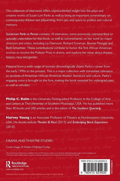 This collection of interviews offers unprecedented insight into the plays and creative works of Suzan-Lori Parks, as well as being an important commentary on contemporary theater and playwriting, from jazz and opera to politics and cultural memory. Suzan-Lori Parks in Person contains 18 interviews, some¿previously untranscribed or specially undertaken for this book, s commentaries on her work by major directors and critics, including Liz Diamond, Richard Foreman, Bonnie Metzgar and Beth Schachter. These contributions combine to honor the first African American woman to receive the Pulitzer Prize in drama, and explore her ideas about theater, history, race, and gender. Material from a wide range of sources chronologically charts Parks's career from the 1990s to the present. This is a major collection with immediate relevance to students of American/African-American theater, literature and culture. Parks's engaging voice is brought to the fore, making the book essential for undergraduates as well as scholars.