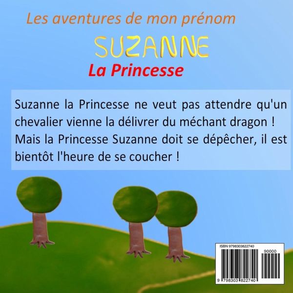 Suzanne la Princesse ne veut pas attendre qu'un chevalier vienne la délivrer du méchant dragon ! Elle est bien décidée à réaliser son rêve... Mais la Princesse Suzanne doit se dépêcher, il est bientôt l'heure de se coucher... Offrez le bonheur de lire à votre enfant avec Les Aventures de mon prénom, des livres personnalisés à son prénom, illustrés en pâte à modeler, à lire avant de dormir. Vous voulez un autre prénom que Suzanne ? Sur notre site internet, choisissez parmi les 14 thèmes des Aventures de mon prénom (pirate, astronaute, cowboy, ballerine...) et personnalisez le livre au prénom de votre enfant. En quelques jours, votre livre sera disponible à la commande sur Amazon !