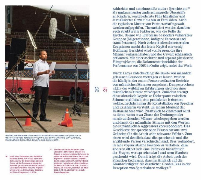 Suzanne Lacy's participative works show the transformative power of art and its potential to initiate social debates. As one of the leading voices of the feminist art movement of the 1970s, Lacy developed social practice, a new model that combined art and social action. In the early 1970s, at an extraordinarily early stage, Lacy addressed sexualized violence in her artwork. In 1972 she organized Ablutions (with Judy Chicago, Sandra Orgel, and Aviva Rahmani), a performance to address rape from the perspective of people who identify as women. Of special note is Three Weeks in May, a three-week performance that revolves around reported rapes in Los Angeles. With these early works, Lacy and her colleagues were pioneers, both artistically and socially, in making gender-based violence a matter of public discussion from a decidedly female perspective. In her works the victims were given a voice and the patriarchal social causes of this violence were named.This small publication accompanies the exhibition at Museum Tinguely that highlights the global relevance and topicality of the subject. Lacy shows a video installation based on her participatory and dialogic performance from 2015. The artist was invited to develop a performance that allowed the letters collected within the scope of the Cartas de Mujeres campaign (2011-12) to receive public attention and acknowledgment. It was a project dedicated to fighting violence against women. The performance, an event with five acts and around four hundred people who identify as men, took place in Quito on November 25, 2015, the International Day for the Elimination of Violence Against Women. The publication includes a scholarly article and an interview of the curator, Sandra Beate Reimann, with the artist.