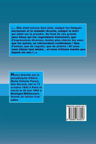 ... Elle était encore bien jolie, malgré les fatigues anciennes et la maladie récente, malgré la mort qui allait me la prendre. Au fond de ses grands yeux bleus qui me regardaient tristement, que d'expressions diverses, toutes plus chères les unes que les autres, se retrouvaient confondues ! Que d'amour, que de regrets, que de prières ! Et nous nous étions tant aimés... et nous n'étions mariés que depuis six ans !...
