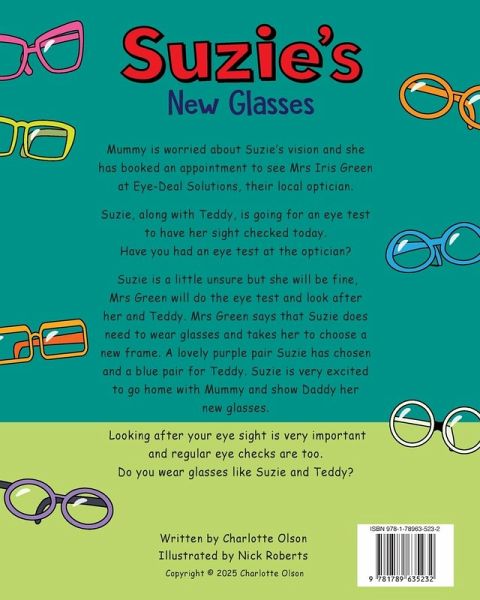 Mummy is worried about Suzie's vision and she has booked an appointment to see Mrs Iris Green at Eye-Deal Solutions, their local optician. Suzie is a little unsure but she will be fine, Mrs Green will do the eye test and look after her and Teddy. Mrs Green says that Suzie does need to wear glasses and takes her to choose a new frame. A lovely purple pair Suzie has chosen and a blue pair for Teddy. Suzie is very excited to go home with Mummy and show Daddy her new glasses.