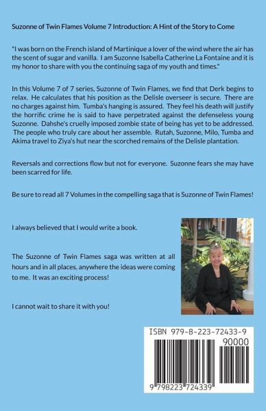 Suzonne of Twin Flames Volume 7 Introduction: A Hint of the Story to Come "I was born on the French island of Martinique a lover of the wind where the air has the scent of sugar and vanilla. I am Suzonne Isabella Catherine La Fontaine and it is my honor to share with you the continuing saga of my youth and times." In this Volume 7 of 7 series, Suzonne of Twin Flames, we find that Derk begins to relax. He calculates that his position as the Delisle overseer is secure. There are no charges against him. Tumba's hanging is assured. Many citizens are intimidated by the very tall muscular Tumba. They feel his death will justify the horrific crime he is said to have perpetrated against the defenseless young Suzonne. Reversals and corrections flow but not for everyone. Suzonne fears she may have been scarred for life. Dahshe's cruelly imposed zombie state of being has yet to be addressed. The people who truly care about her assemble. Rutah, Suzonne, Milo, Tumba and Akima travel to Ziya's hut near the scorched remains of the Delisle plantation. There, under Rutah's direction they begin the grueling ritual of locating Dahshe's soul. Andre shocks Suzonne by sending a wagon train of lavish gifts for everyone who participated in his recovery. What has Andre selected for Suzonne? Raphael gives Suzonne a sobering lecture. "These gifts are a gentleman's way of saying he cannot or will not give you himself." Later, Raphael decides the time has come to tell Suzonne the truth about her parents and their family. Suzonne learns that she and only she can legally avenge the murder of her grandparents and the theft of their property, the original Twin Flames chateau in France. Suzonne is compelled to honor her deceased father's wishes and travel to Paris! How will Suzonne do this without encountering Andre? Impossible! Be sure to read all 7 Volumes in the compelling saga that is Suzonne of Twin Flames!