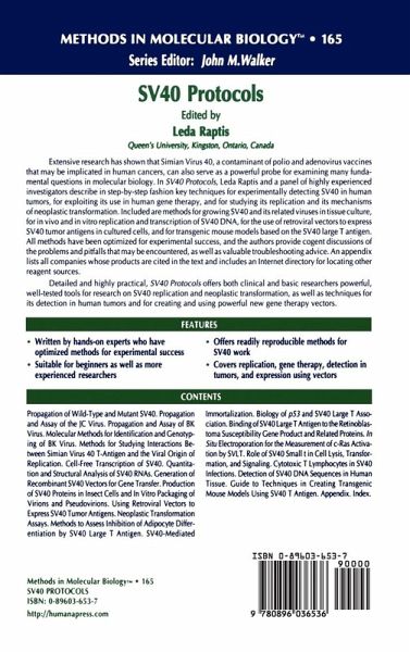 Simian virus 40 gained notoriety in the 1960s because it was found to be a contaminant of polio and adenovirus vaccines that had been administered to millions of healthy individuals worldwide. The public health implications of this revelation provided the initial impetus for an in-depth study of SV40 biology. Later work showed that SV40 DNA sequences as well as infectious virus are in fact found in human tumors and may have contributed to oncog- esis. It also turned out that SV40 uses mostly cellular machinery to carry out many steps in viral infection, which makes it a powerful probe for examining many fundamental questions in eukaryotic molecular biology. SV40 Pro- cols consolidates a number of well-tested step-by-step techniques in one v- ume; experts with hands-on experience in particular methods give detailed accounts of their optimized experimental protocols, so that the beginner, as well as more experienced researchers, may readily overcome problems of ambiguity often present in the literature. As with other DNA tumor viruses, the response of cultured cells to SV40 infection depends upon the species being infected. Monkey cells s- port virus production, which leads to their death, whereas rodent cells p- duce only the early proteins and acquire a transformed phenotype. Thus, SV40 Protocols is organized in two sections. The first relates to assays of the lytic cycle of the virus, and the second deals with transformation.