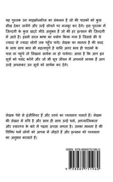 Yeh pustak un microblogs ka sankalan hai jo ki pathako ko kuch seekh dekar jaayenge aur unhe sochane par majbor kar denge. Is pustak me zindagi ke kuch khatte meethe anubhav hain jo ki har insaan ki zindagi mein aate hain. Isame saral bhasha ka prayog kiya gaya hai jisase ki ye jyada se jyada logon tak pahunch paye. Lekhak ka manana hai ki shabd ke sath sath bhav bhi mahatvpoorn hai yani agar bhav hi pathako ke paas na pahunche to likhana sarthak na ho payega. Aasha hai ki aap in sutron ko pasand karenge aur jo bhi sootr jeevan me apanane layak hain aap unhe apnakar un sutron ko saarthak kar denge.