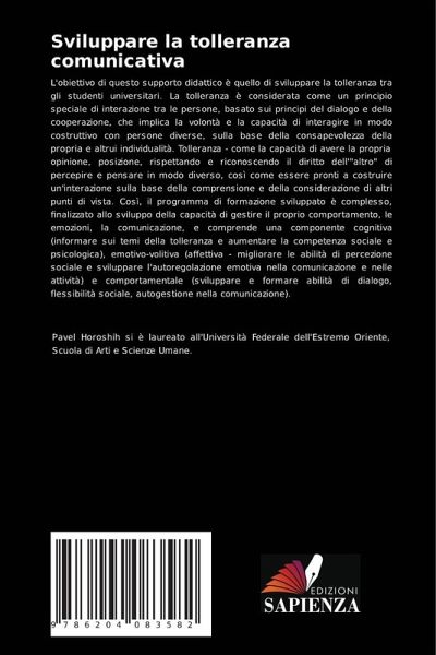L'obiettivo di questo supporto didattico è quello di sviluppare la tolleranza tra gli studenti universitari. La tolleranza è considerata come un principio speciale di interazione tra le persone, basato sui principi del dialogo e della cooperazione, che implica la volontà e la capacità di interagire in modo costruttivo con persone diverse, sulla base della consapevolezza della propria e altrui individualità. Tolleranza - come la capacità di avere la propria opinione, posizione, rispettando e riconoscendo il diritto dell'"altro" di percepire e pensare in modo diverso, così come essere pronti a costruire un'interazione sulla base della comprensione e della considerazione di altri punti di vista. Così, il programma di formazione sviluppato è complesso, finalizzato allo sviluppo della capacità di gestire il proprio comportamento, le emozioni, la comunicazione, e comprende una componente cognitiva (informare sui temi della tolleranza e aumentare la competenza sociale e psicologica), emotivo-volitiva (affettiva - migliorare le abilità di percezione sociale e sviluppare l'autoregolazione emotiva nella comunicazione e nelle attività) e comportamentale (sviluppare e formare abilità di dialogo, flessibilità sociale, autogestione nella comunicazione).