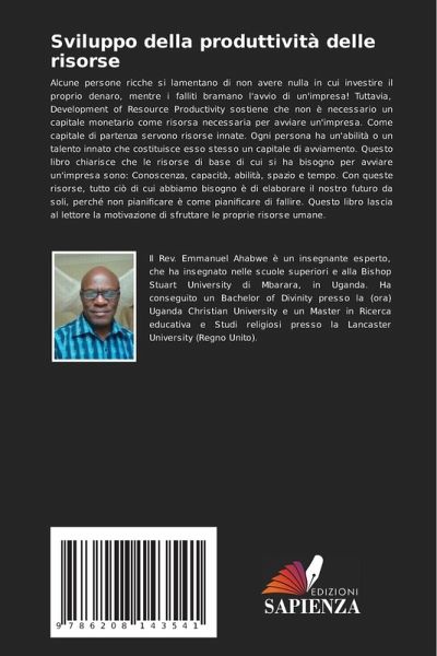 Alcune persone ricche si lamentano di non avere nulla in cui investire il proprio denaro, mentre i falliti bramano l'avvio di un'impresa! Tuttavia, Development of Resource Productivity sostiene che non è necessario un capitale monetario come risorsa necessaria per avviare un'impresa. Come capitale di partenza servono risorse innate. Ogni persona ha un'abilità o un talento innato che costituisce esso stesso un capitale di avviamento. Questo libro chiarisce che le risorse di base di cui si ha bisogno per avviare un'impresa sono: Conoscenza, capacità, abilità, spazio e tempo. Con queste risorse, tutto ciò di cui abbiamo bisogno è di elaborare il nostro futuro da soli, perché non pianificare è come pianificare di fallire. Questo libro lascia al lettore la motivazione di sfruttare le proprie risorse umane.