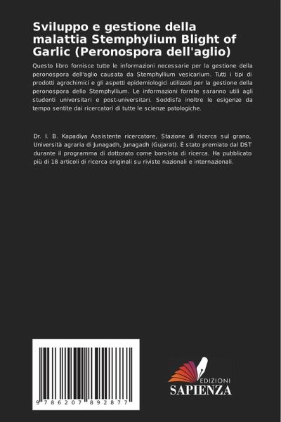 Questo libro fornisce tutte le informazioni necessarie per la gestione della peronospora dell'aglio causata da Stemphyllium vesicarium. Tutti i tipi di prodotti agrochimici e gli aspetti epidemiologici utilizzati per la gestione della peronospora dello Stemphyllium. Le informazioni fornite saranno utili agli studenti universitari e post-universitari. Soddisfa inoltre le esigenze da tempo sentite dai ricercatori di tutte le scienze patologiche.