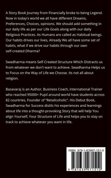 A Story Book Journey from Financially broke to being Legend. Now in today's world we all have different Dreams, Preferences, Choices, opinions. We should also add something in our daily life as per our Life Goals along with our daily Religious Practices. As Humans are called as Habitual beings. We all have some set of habits, what if we drive our habits through our own self-created Dharma? Swadharma means Self-Created Structure Which Distracts us from whatever we don't want to achieve. Swadharma Helps us to Focus on the Way of Life we Choose. Swadharma is not all about religion. Let's drive our own life and through Swadharma. Basavaraj is an Author, Business Coach, International Trainer who reached 95000+ Pupil around world in 82 countries, Founder of "Retailcoholic". His Debut Book, Swadharma for Success distils his experiences and learnings about life into a thought-provoking Story that will help You align Yourself, Your Structure of Life and helps you to stay on track to achieve whatever you want in life.