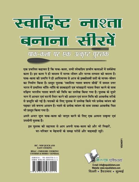 Eek pracalit kahaavat hai ki paak-kala, sabhee lookapriy praaceen kalaoon meen sarvashreeshth kala hai. Is kala nee hee vaastav meen maanav-jeevan aur maanav-sabhyata koo badala hai. Paak-kala kee utpatti nee hee aadimaanav see aaj kee ikkeesaveen sadee kee maanav-jeevan ka nirmaan kiya hai. Prastut pustak svaadisht naasta banaana seekheen meen samast uttar bhaarat meen pracalit bhaanti-bhaanti kee shaakaahaaree eevan maansaahaaree naasta taiyaar karanee kee saath dakshin bhaarateey naasta banaanee kee vidh ika ulleekh kiya gaya hai. Pustak kee duusaree bhaag meen aacaar eevan catanee taiyaar karanee kee aasaan eevan saral vidh ikee aakarshak tareekee see prastuti kee gaee hai. Paathakoon kee liee pustak meen ulleekh kiyee gayee pratyeek vyannjan koo parhakar usee banaana aasaan hai. Naastee kee pratyeek vyannjan kee saath usaka aakarshak citra bhee prastut kiya gaya hai. Apanee andar supt paak-kala koo jaagrt karanee kee liee yah atyant utvrphasht eevan upayoogee pustak hai. Is pustak kee sahaayata see aap apanee paak-kala koo aur bhee nikhaareen, ghar-parivaar va meehamaanoon kee samaksh parooseen aur vaahavaahee luuteen.(It is said that cooking is an art. It is also a science that keeps the stomach supplying energy to the whole body. Breakfast is the first meal of the day and must be tastefully prepared; so different recipes of dishes are here for you to try. The book contains the recipes of North Indian dishes for vegetarians as well as for non-vegetarians. Pickle and sauce making ideas are also given. ) #v&spublishers
