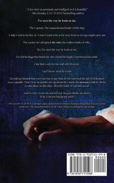 "A love story as passionate and intelligent as it is beautiful."- Alta Hensley, USA TODAY bestselling author I've seen the way he looks at me. The Captain. The unquestioned leader of this ship. A ship I wish to be free of. A man I want to be as far away from as my legs might carry me. The society he's designed, the rules, the endless battle of wills... Yes, I've seen the way he looks at me. I've felt his fingertips brush my skin. Heard his laugh. Experienced his smile. One that's only for me, and only in secret. And I know what he wants. He told me himself that everyone has to pay; that all who survived the fall of civilization were culpable. That's how he justifies the decisions he's made, the necessary evils he allows to take place on this ship... all in the name of a greater good. And it's why I resist the starved way his gaze drinks me down. Why I can't be had at any price. SWALLOW IT DOWN is an angst-ridden, enemies to lovers romance, boasting a strong female lead and a swoon worthy hero. This standalone features an HEA that will keep you turning the page all night.