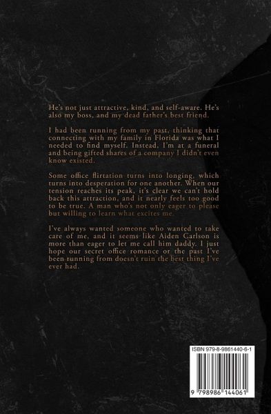 He's not just attractive, kind, and self-aware. He's also my boss, and my dead father's best friend. I had been running from my past, thinking that connecting with my family in Florida was what I needed to find myself. Instead, I'm at a funeral and being gifted shares of a company I didn't even know existed. Some office flirtation turns into longing, which turns into desperation for one another. When our tension reaches its peak, it's clear we can't hold back this attraction, and it nearly feels too good to be true. A man who's not only eager to please but willing to learn what excites me. I've always wanted someone who wanted to take care of me, and it seems like Aiden Carlson is more than eager to let me call him daddy. I just hope our secret office romance or the past I've been running from doesn't ruin the best thing I've ever had.