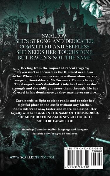 Swallow She's strong and dedicated, Committed and selfless. She needs her touchstone, But Raven's not the same. Reeling from the impact of recent tragedy, Raven isn't as focused as the Kindred need him to be. When old enemies return without showing any respect, timetables at McCormack Manor change. The danger hasn't dwindled. Only her Love has the strength and the ability to steer them through. He has to excel in his dominance or they may never survive. Zara needs to fight to close ranks and to take her rightful place in the outfit without any hitches. She's different now, faster and more dedicated. Her loyalty will be tested. In the name of the Kindred, she must do things she never thought she'd be capable of. Warning: Contains explicit language and imagery. Suitable only for ages 18 and over.